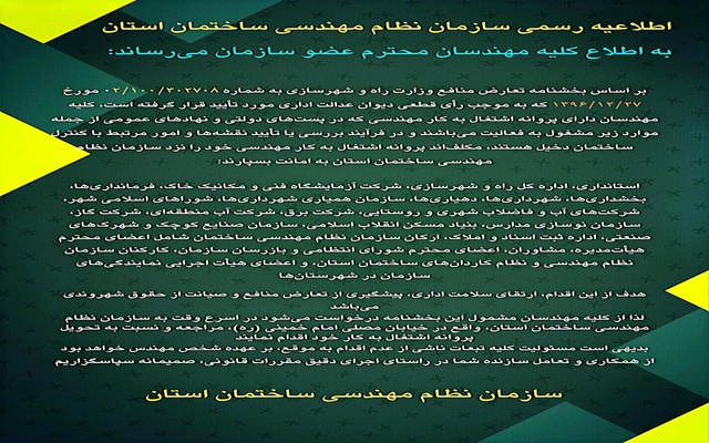 اطلاعیه مهم در مورد تعارض منافع مهندسان شاغل در نهادهای دولتی ، صادر شد. از همکاری و تعامل سازنده شما مهندسین فرهیخته در راستای اجرای دقیق مقررات قانونی، صمیمانه سپاسگزاریم